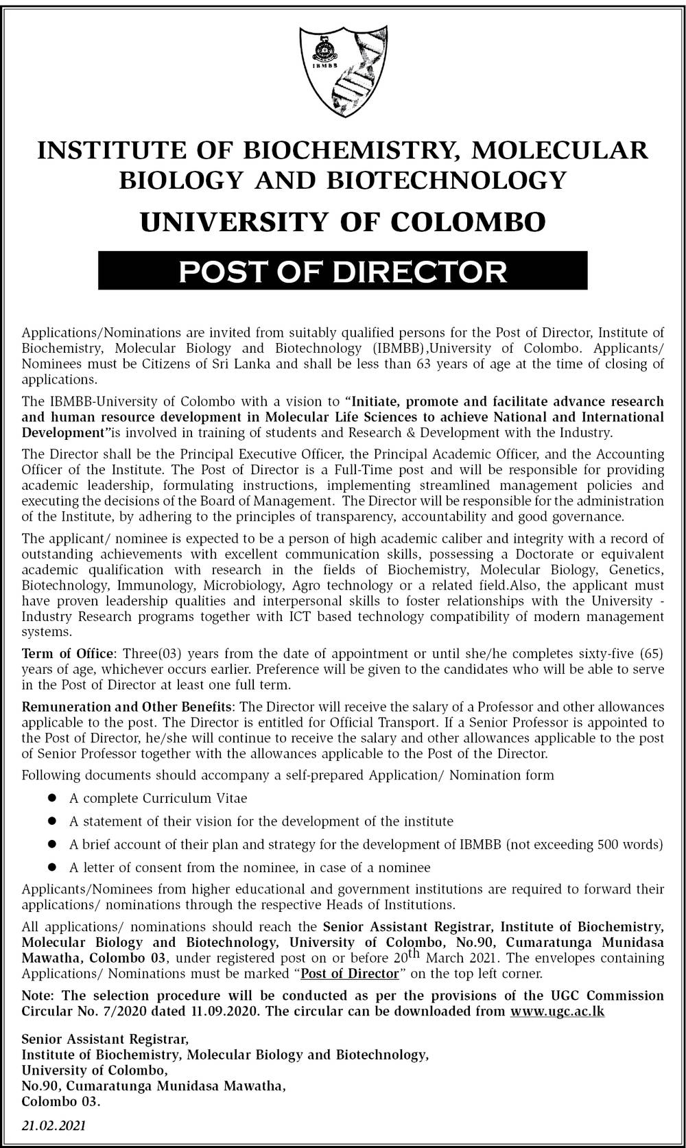 Director Institute Of Biochemistry Molecular Biology Biotechnology University Of Colombo Xpressjobs
